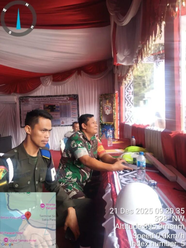 Simalungun, investigasihukumkriminal – Kehadiran aparat keamanan di tengah aktivitas masyarakat kembali memberikan rasa aman dan nyaman, khususnya di kawasan wisata. Babinsa Koramil 11/Girsang Sipangan Bolon Kodim 0207/Simalungun, Sertu Bambang Purnomo dan Serda Evo Simanjuntak, melaksanakan tugas pengamanan dan pelayanan masyarakat di Pos Pelayanan (Pos Yan) III Pantai Bebas Parapat, Kelurahan Parapat, Kecamatan Girsang Sipangan Bolon, Kabupaten Simalungun, pada Minggu (21/12/2025).