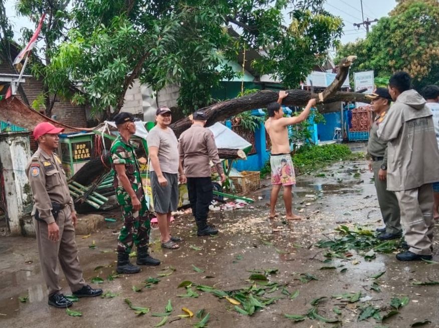Bhabinkamtibmas Polsek Sliyeg Aipda Ade C bersama Bripka Boby, Babinsa Serma Rastika, dan anggota Satpol PP Mp Yanto langsung melakukan pembersihan batang dan ranting pohon, serta mengamankan lokasi agar warga dapat kembali melintas dengan aman.