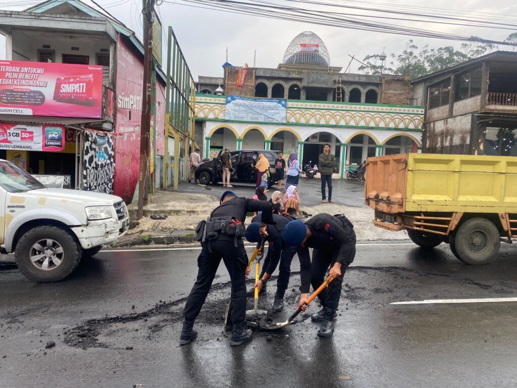 investigasihukumkriminal – Personel Batalyon B Pelopor Satuan Brimob Polda Jawa Barat melaksanakan aksi cepat tanggap dengan membersihkan material pasir dan kerikil sisa aspal yang rusak akibat arus air deras setelah diguyur hujan lebat di kawasan Cikole, Lembang, khususnya di Jalan Raya Tangkuban Perahu, Selasa (30/9/2025).